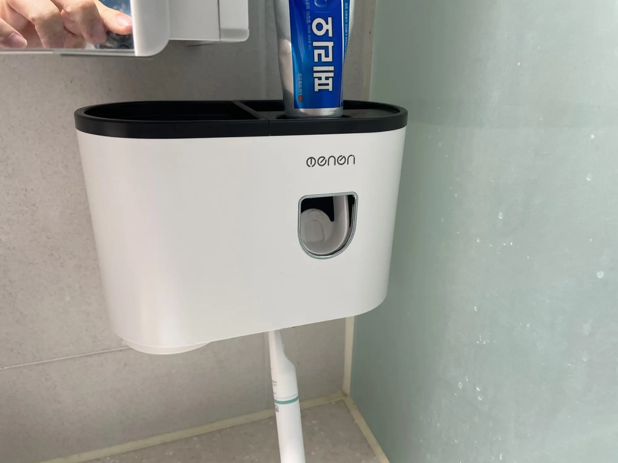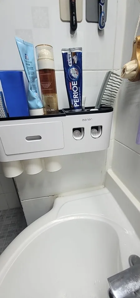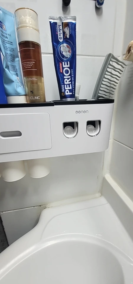 I bought it because I want to clean up my bathroom, which is nice. On the left side, a plastic cup is attached upside down with a magnet. If you connect the right toothpaste and push it with a toothbrush, it is convenient to squeeze the toothpaste.